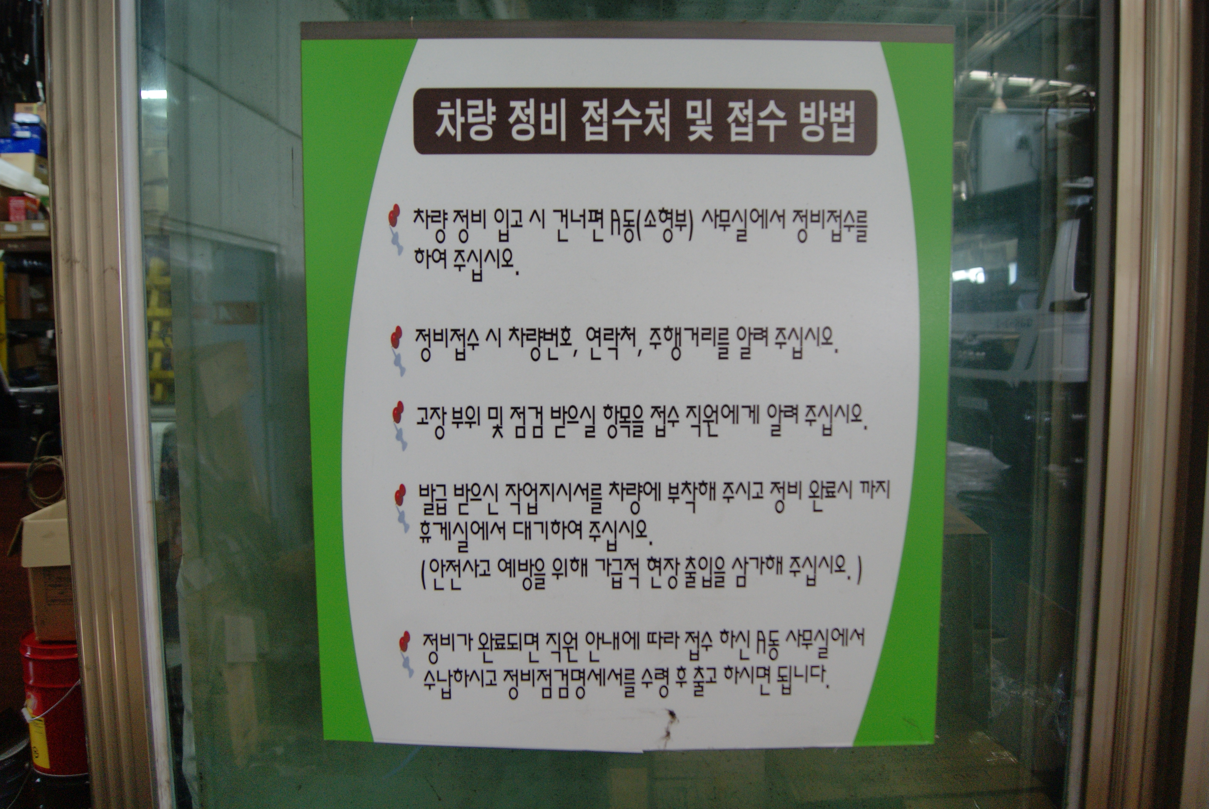 1. 차량 정비 입고시 건너편 A동(소형부) 사무실에서 정비 접수를 하여 주십시오
